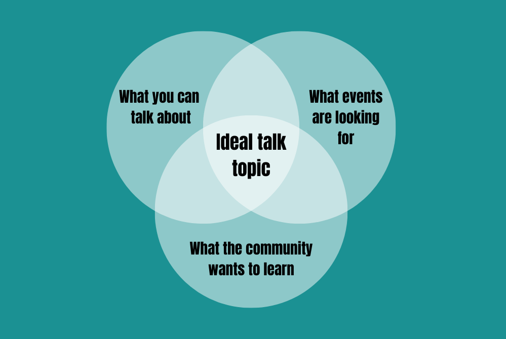 So: when taking time to brainstorm talk ideas, keep the above framework in mind. If you're unsure where to start, begin with thinking about the events that you'd like to speak at or the community that you want to help. Consider what other people would like to hear about and use that as a starting point to generate ideas.
