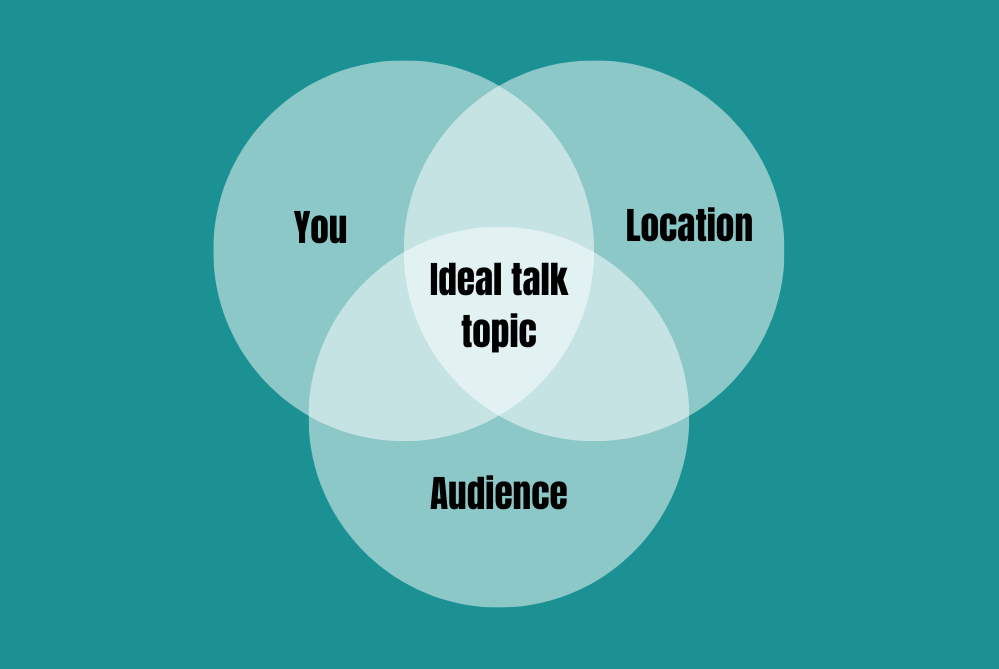 If you have a specific location in mind, it can help you come up with a topic that is appropriate for it. This way you start with the event and the event organisers, and ask yourself: what type of talk do they want to see? What type of talks have done well at those events previously? What talks will gets accepted? Once you know the location, you likely have an idea of what the audience there looks like, and then can shape the topic to them.