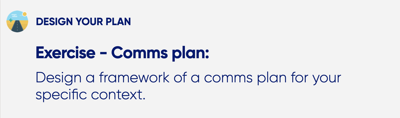 The first exercise in this post is to design the framework of the comms plan for your specific context. I know that's easier said than done, so let's break it down into a couple of steps: