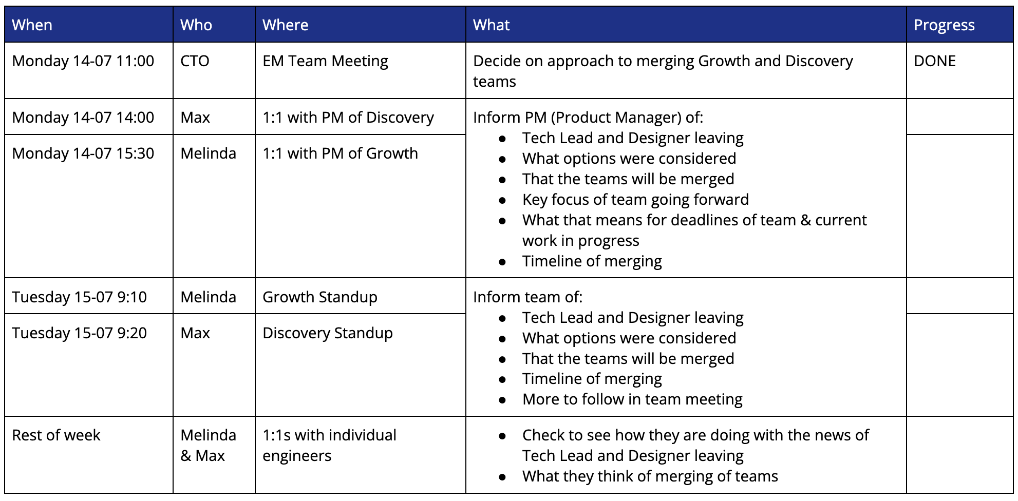 Here’s an example based on a format I’ve used in the past and loosely based on a real life example. In this situation, we had to communicate to 2 teams that they were being merged, and making sure we staggered the conversations in the right way: