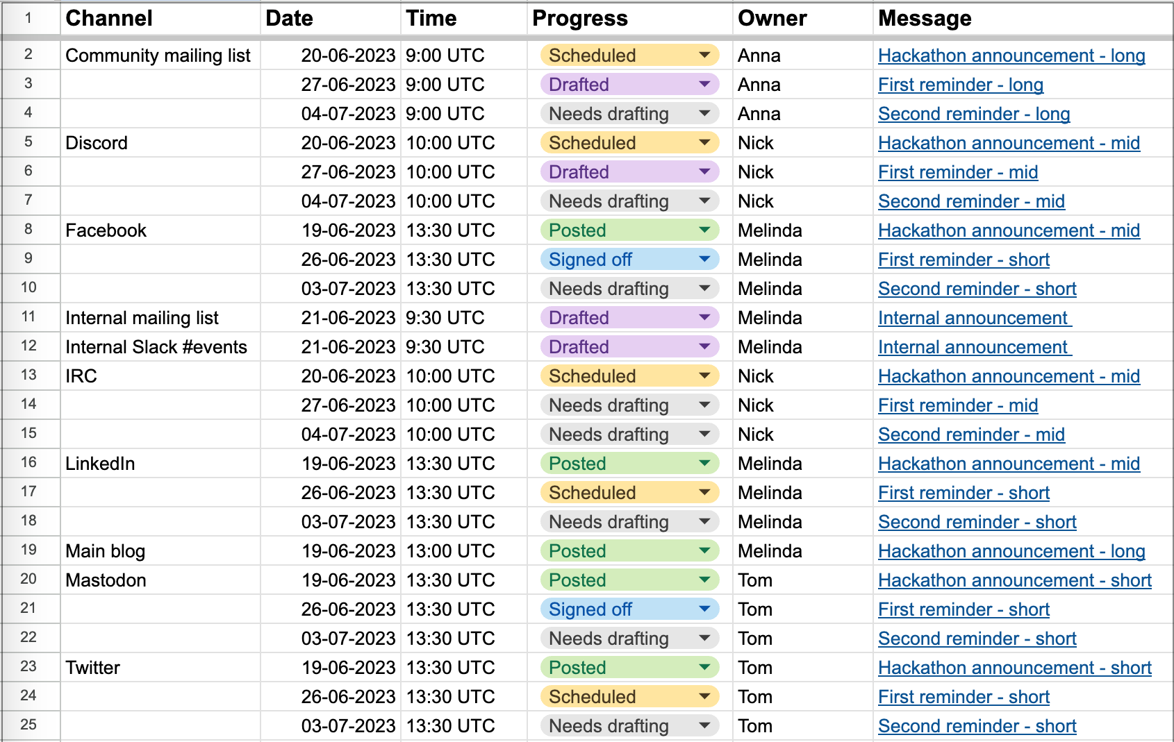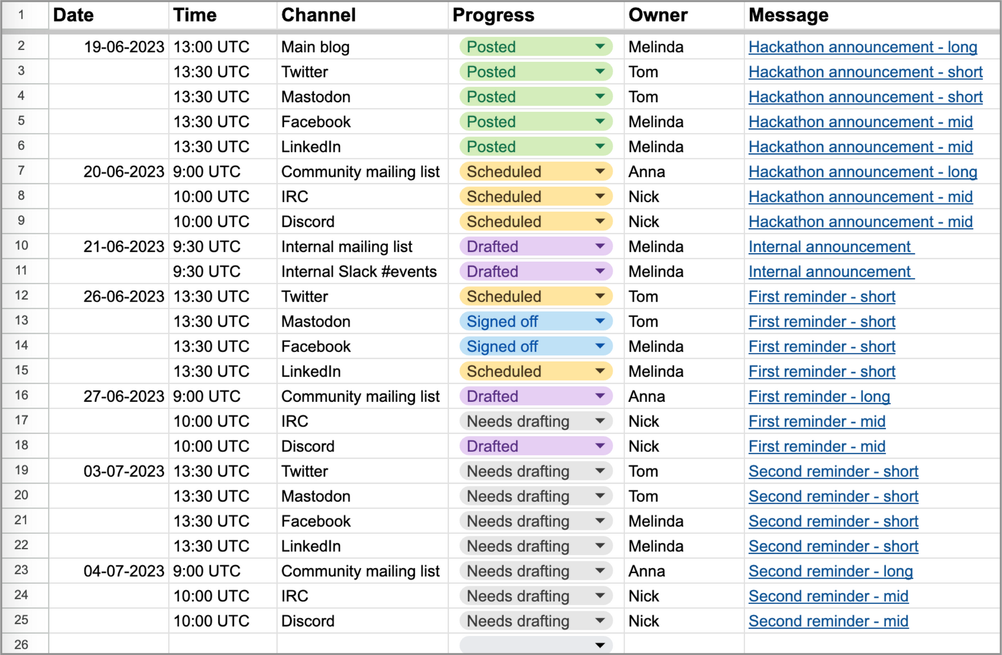 Again each of these will be dependent on your specific comms, as to how important it is and what about it you want to visualise. For instance, the state of the message might be a simple Not Done/Done, but in some cases you might want to break this down further, like keeping track of Drafted, Proofread, Signed Off, Scheduled, and Published.