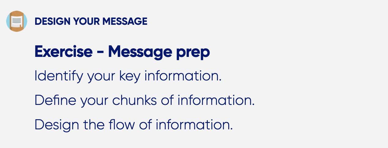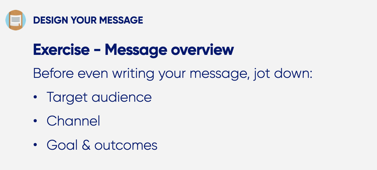 So in the previous step, we designed our comms plan and listed out which individual messages we need to communicate that comms. Now we're taking a closer look at each individual message - what do we need to take into account when designing that message?