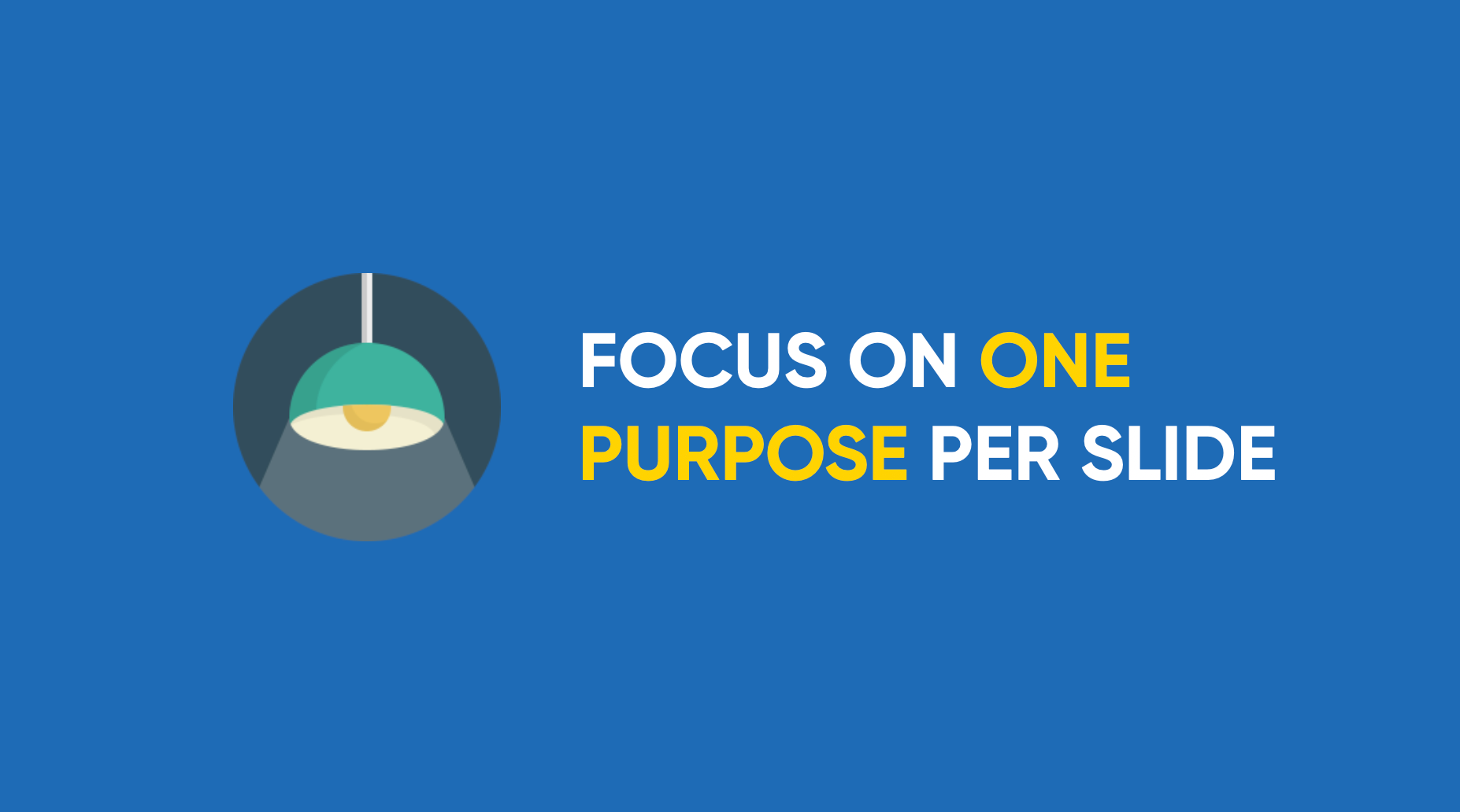 Now it is up to you to decide on what falls under that one purpose for that specific slide. Different speakers will convey their stories in different ways, and you need to decide how you break that story down into smaller parts for the audience to digest. What's the key thing that you're trying to get across right now to your audience? Focus on that specific thing as your purpose for this slide.