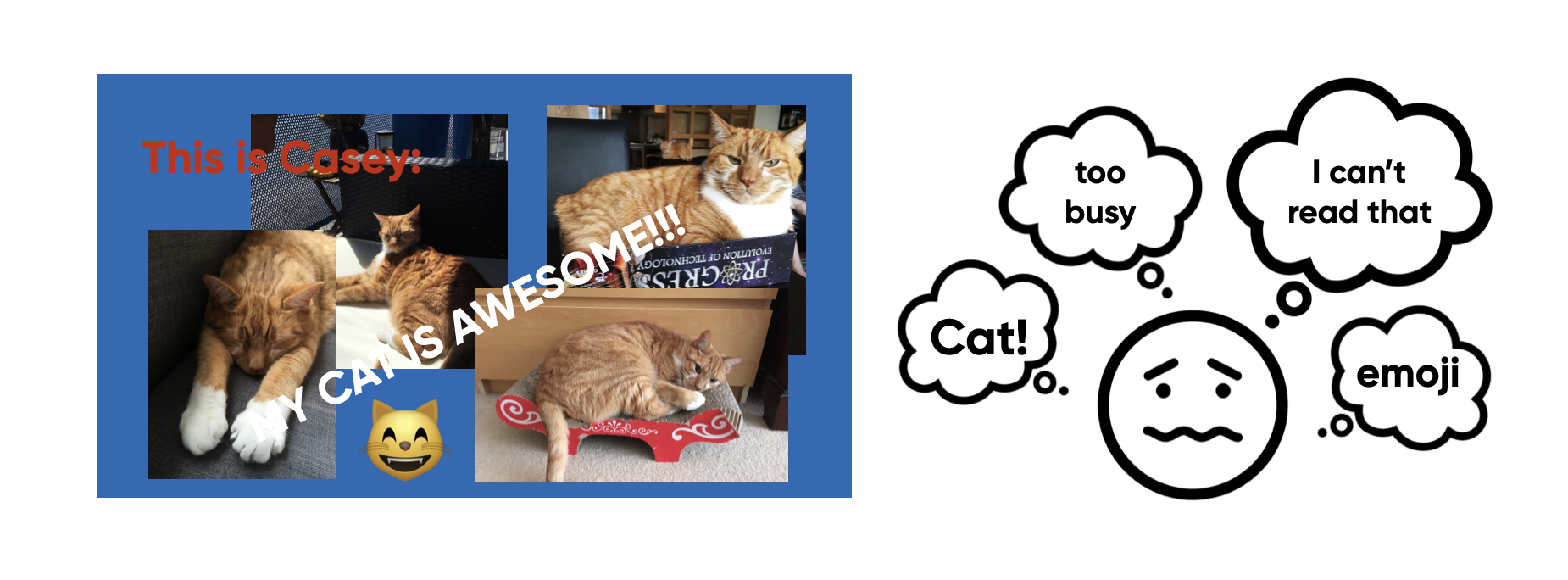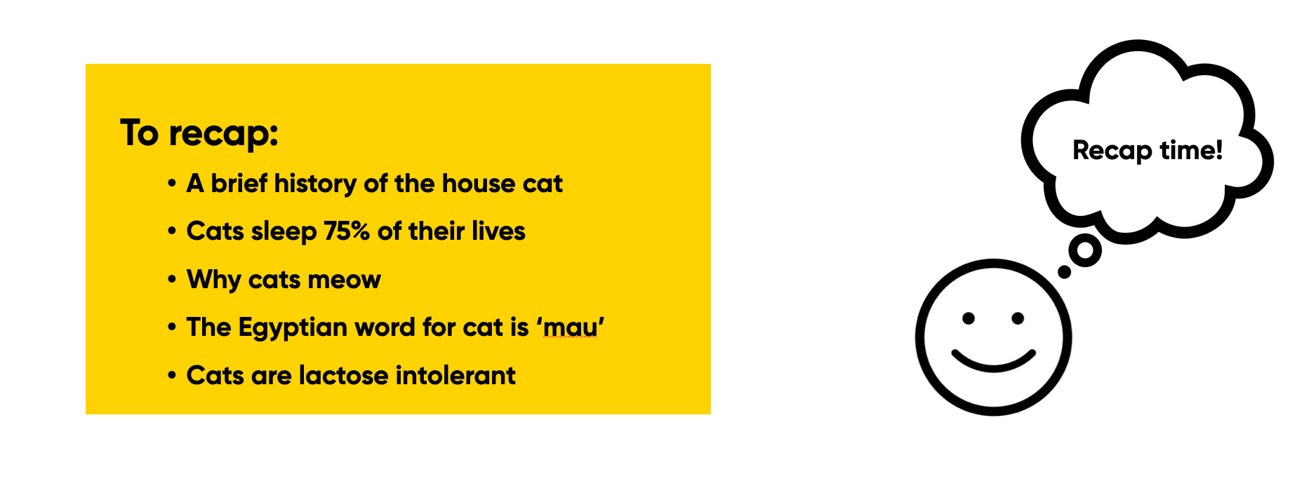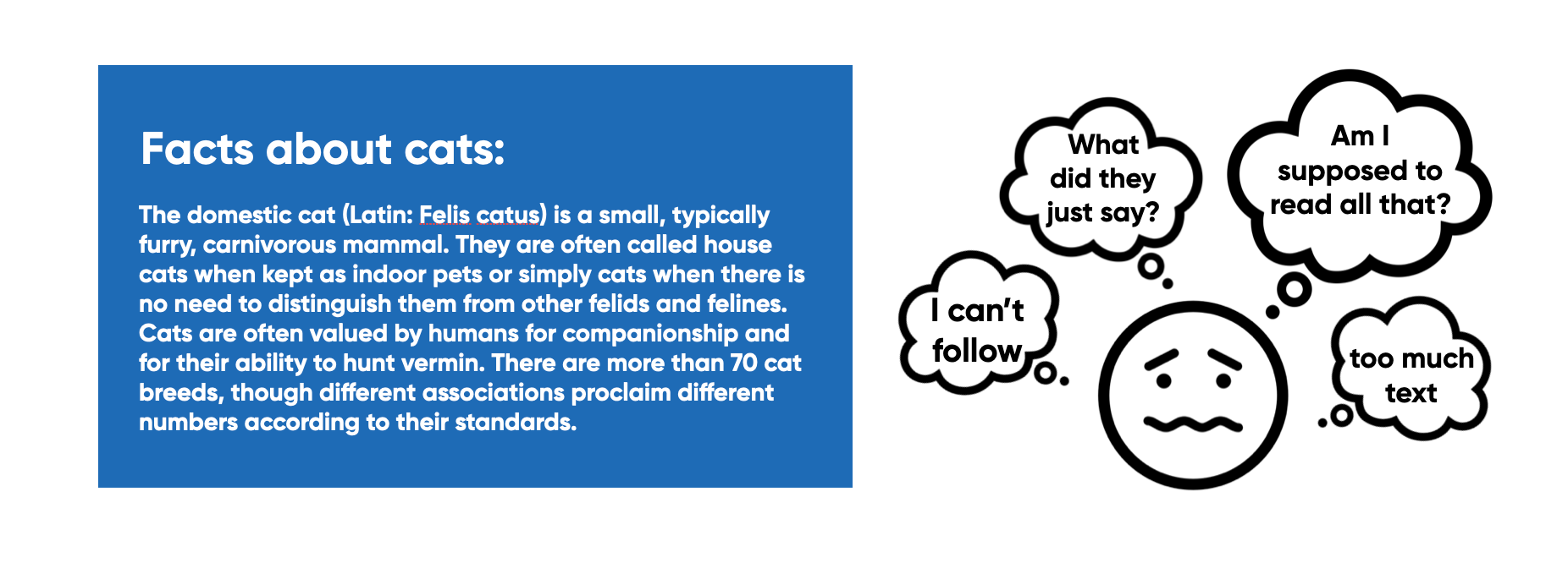 While you are talking about the history of cats – your audience is reading and thinking about all the other things that are on your slide already and they won’t be listening to you.